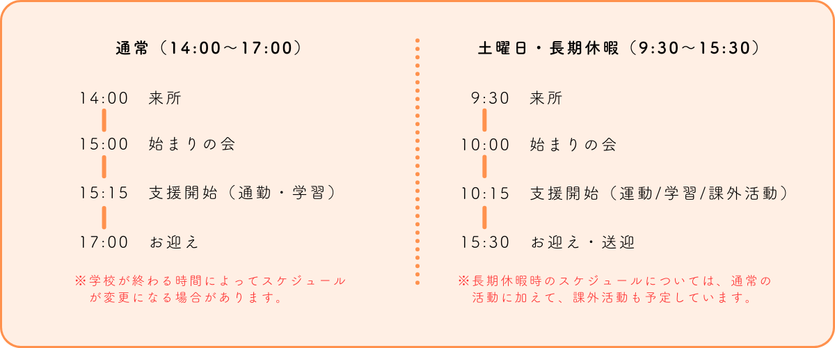 サーキット運動、リズム遊び、感覚統合遊び、園芸活動、クッキング、野菜の栽培、収穫体験、身支度トレーニング、手洗い・うがい、個別学習、宿題サポート、工作絵本の読み聞かせ、SST、買い物体験、季節の行事など